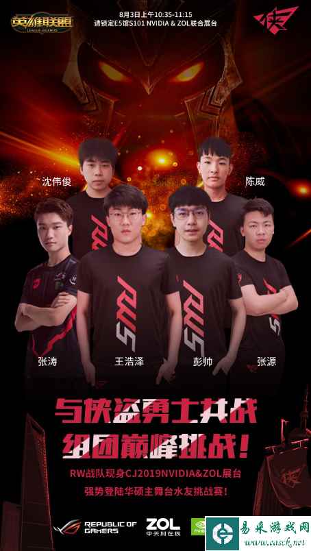 ROG星耀NVIDIA展台,是华硕与NVIDIA共同打造的的现场活动,“侠盗勇士”RW英雄联盟战队将于8月3日10:35现身ChinaJoy 2019现场,参与华硕主舞台的水友挑战赛。转发相关微博将抽送5张京东卡、1套ROG信仰积木、1顶RW战帽、1件RW战衣T恤,欢迎广大游戏爱好者锁定E5馆S101 NVIDIA & ZOL联合展台。