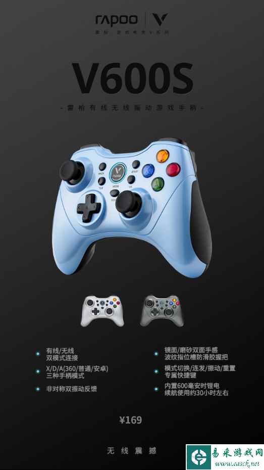 双模畅玩——雷柏V600S有线无线振动游戏手柄是RAPOO雷柏实力大厂上市企业,领军国产外设品牌旗下游戏V系列外设日前推出新近王牌游戏手柄。有线/无线双模式的连接,缤纷多彩的3色,600mAh大容量内置锂电池;镜面加磨砂双面手感,5S级人体工学、360类手柄外观架构;X/D/A三核三模,一键切换,满足不同平台使用;专属VIB振动开关键、专属TUR连发快捷键;非对称模拟双振动马达;智能手柄芯片,手柄模式断电记忆,固件可升级;电竞级性能、品质,快速响应,长使用寿命等,烙下了雷柏V600S强悍实用的标签。