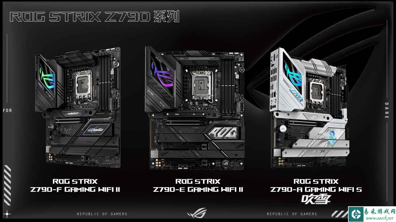 此外,ROG玩家国度Z790系列主板新品支持AURA SYNC神光同步,板载第二代可编程ARGB灯带接针,可与其他设备一起进行灯效联动。ROG MAXIMUS Z790 FORMULA配备创新十足的2英寸LiveDash OLED系统状态显示屏,可实时显示重要系统信息及自定义图形或动画。而ROG MAXIMUS Z790 DARK HERO的Polymo动态灯效,赛博律动,尽享炫酷视觉盛宴。 ROG MAXIMUS Z790 FORMULA主板预约价5999元,可享6期免息福利。购买链接:https://item.jd.com/100070496410.html ROG MAXIMUS Z790 APEX ENCORE主板预约价5499元,可享6期免息福利。购买链接:https://item.jd.com/100070496560.html ROG MAXIMUS Z790 DARK HERO主板预约价5399元,可享6期免息福利。购买链接:https://item.jd.com/100070786377.html 潮流电竞,致胜利器——ROG STRIX猛禽Z790系列 ROG STRIX猛禽系列作为ROG玩家国度新贵,专为追求个性的新潮电竞玩家打造。ROG STRIX猛禽Z790系列主板共推出3款新品,分别是ROG STRIX Z790-E GAMING WIFI II、ROG STRIX Z790-F GAMING WIFI II,以及华硕Z790吹雪新主板(ROG STRIX Z790-A GAMING WIFI S)。