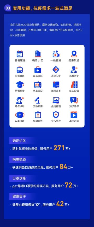 在功能服务方面,「同呼吸,共战“疫”」专栏不断更新多项实用功能,上线了“确诊小区”、“病患轨迹”、“口罩攻略”、“健康自评”、“免费问诊”、“明星战疫”、“个人防护”等共计20项功能模块,让用户的防疫需求得到一站式满足。