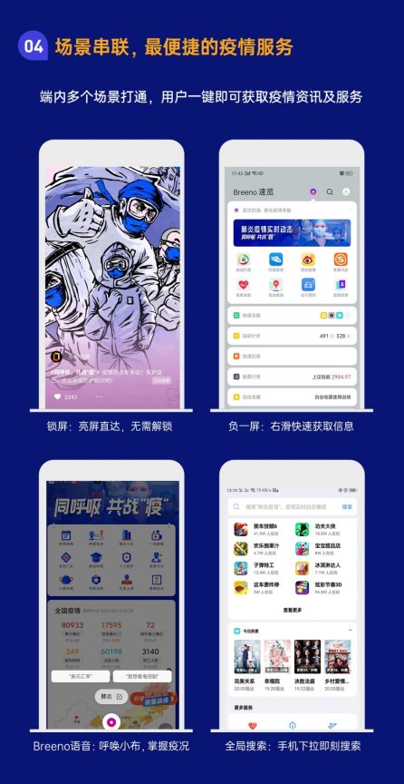 此外,各大内容入口场景均策划上线了多项定制专题,充分发挥渠道优势,通过创新的内容及形式做好防疫内容的宣传工作。例如,乐划锁屏亮屏直达,无需解锁即可查阅疫情实况信息;负一屏通过右划即刻掌握疫情信息,更有「密切接触者测量仪」免安装即可快速查看自己是否接触过传染源;Breeno语音则结合自身AI技术,实现呼唤小布及时掌握疫况,同时携手王凯、Angelababy、范丞丞、陈赫、佟大为、李晨、海清、王子文、周笔畅、刘芸、乔欣等明星,为用户送上疫情防控小贴士。