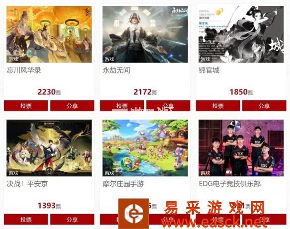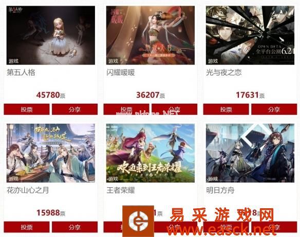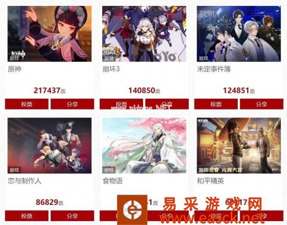 游戏类里,米哈游作品包揽前三名,代表作《原神》得票数最多,《崩坏3》拿下第二,《未定事件簿》夺得第三,《王者荣耀》未能进入得票榜前十。 本次投票将于3月25日结束,4月26日进行颁奖。 游戏类投票地址>>> 《原神》目前拿下217437票夺得第一,前10名榜单为: 1、《原神》 2、《崩坏3》 3、《未定事件簿》 4、《恋与制作人》 5、《食物语》 6、《和平精英》 7、《第五人格》 8、《闪耀暖暖》 9、《光与夜之恋》 10、《花亦山心之月》