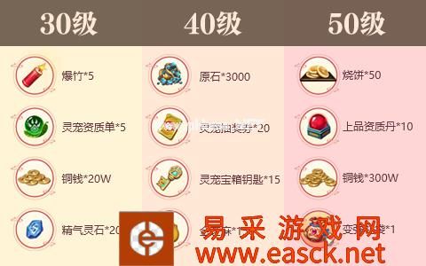 在进入游戏后,当角色达到相应等级时可获得额外的成长礼包。等级越高,获得的礼包越丰厚。尤其是,当角色等级到达三十级时,可获得爆竹*5、灵宠资质单*5、铜钱*20W、精气灵石*20;当角色到达四十级时,可获得原石*3000、灵宠抽奖券*20、灵宠宝箱钥匙*15、金芝麻*150;当角色等级到达五十级时,可获得绑定烧饼*50 、上品资质丹*10 、铜钱*300W,还有神秘变强礼袋等你来拿。