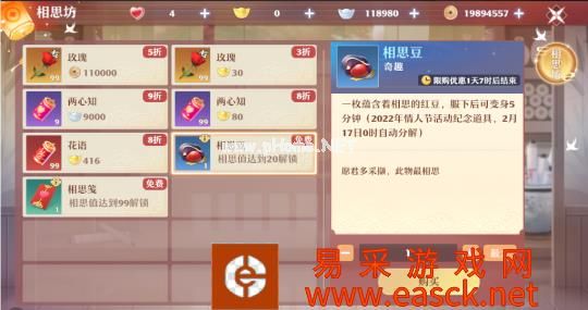 另外一个就是相思坊开放,上架了玫瑰花、两心知、花语情缘烟花、相思豆、相思笺道具。蕴含相思的“相思豆”,服下之后可变身五分钟,幻化特殊形象游走神州大地。 而“相思笺”则可以到指定地点触发稀有奇缘悠悠我心,两人一起完成奇缘后,可获得特殊道具相思笺,不限定次数燃放花灯,这个可太浪漫了!