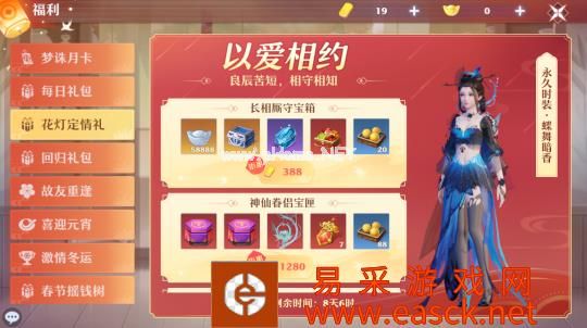 花灯定情礼包,本次元宵节一共推出4个宝箱,「情满人间福袋」免费领取,人手一个。 「长相厮守宝箱」含58888银子、8个天书残卷灵匣、1个将星石,这个礼包真的很实惠,折算成银两三十多万,正常300多金锭只能换到三万多银两,现在足足多了10倍。