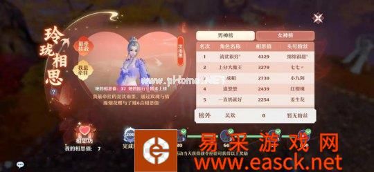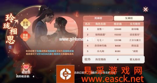 活动还设置了“男神榜”和“女神榜”,根据玩家收到的相思值数量进行排行,不过2月14日24点之后,排行榜已经不再刷新。 目前榜上前10名玩家可以获得30日限时头像框,男神、女神榜前10名玩家分别获得“曾经沧海难为水”、“除却巫山不是云”的专属紫色称谓。