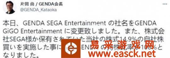 片冈尚在推特中表示:“今日,GENDA世嘉娱乐的公司名称已变更为GENDA GiGO娱乐,此外GENDA世嘉娱乐将世嘉持有的14.9%股份收购后,GENDA的持股比例达到100%。”