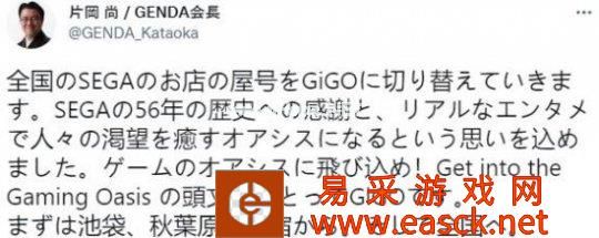 GENDA会长片冈尚在之后的推特中表示:“我们将把全国世嘉商店的名称改为GiGO。感谢世嘉56年的历史,希望它成为一个用现实娱乐满足人们渴求的绿洲。GiGO是Get into the Gaming Oasis(跳入游戏的绿洲!)的首字母缩写词。首先从池袋、秋叶原和新宿等地开始,随后传遍(日本)全国。”