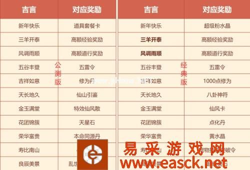 春节前打年兽,将这个带来灾难与疫病的坏蛋打跑,已经是我们的传统习俗之一了。若能按照任务提示击杀指定类型的年兽,还可找到指定NPC兑换额外奖励。 道友们每天保持在线和活跃还可以获得从文昌星君处借吉言的机会,将获得的吉言字符凑成指定的四字成语吉言,就能领取到对应的奖励啦。如果免费获得的次数用完了,还可以花费元宝购买次数。如果没有配成成语,就只能获得少量经验和道行奖励啦。