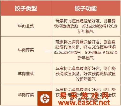春联贺喜活动也十分有趣,道友们完成“笔墨纸砚”四个小活动任务则可解锁上联/下联,解锁后选择你认为最合适的文字组成上联/下联,组成对联后提交,在当日20点之前会有排行,玩家可在排行榜给其他人的对联进行点赞,点赞最高的还可获得额外奖励。 过春节吃顿暖心又暖胃的饺子自然也是必不可少的,不过这顿饺子可是需要道友亲自动手制作的呢。在npc处领取羊肉、牛肉、韭菜、芹菜后,就可以到活动大使处制作饺子了。分别可以做出牛肉韭菜、牛肉芹菜、羊肉韭菜、羊肉芹菜四种口味的饺子,赠送给好友后会有四种不同的效果。