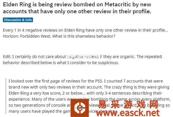据外媒报道,许多Reddit用户认为这些刷差评的可能是《地平线:西之绝境》的粉丝们干的。此前《西之绝境》的开发人员也在个人社交平台吐槽《艾尔登法环》地图等设计的不好,网友们可能觉得他们的粉丝认同了其看法并付诸了行动。