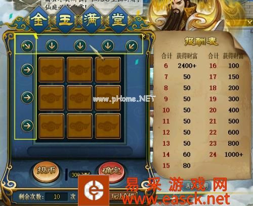 那么合计的数值是根据什么计算的呢?很简单,我们来尝试玩一下就知道啦!花费300金元宝进行投币后,九个石板中会有随机两个石板翻开出现数字,此时你可以根据出现的数字,从其余未翻开的石板中任选一个,使其翻转,观察上面的数字。得到三块石板的数字后,再从石板外圈的八个方向箭头中选定一个方向,点击确定后,全部石板都翻转出数字,你选择的那个方向上的3个数字之和,就是合计的结果。