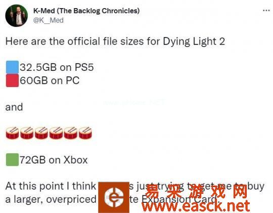 推主K__Med在一则推文中称,《消逝的光芒2》的Xbox版容量将达到72GB,是PS5版(32.5GB)的两倍多,而PC版的《消逝的光芒2》则需要占用60GB的存储空间(Steam页面已证实)。