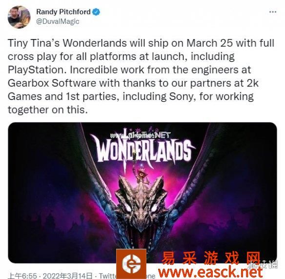 Randy Pitchford说道:“《小缇娜的奇幻之地》将于3月25号发售,推出时包括Playstation在内的所有平台都可进行跨平台联机。Gearbox Software 的工程师所做出了令人难以置信的工作,感谢我们在 2k Games 的合作伙伴和包括索尼在内的第一方的共同努力”。