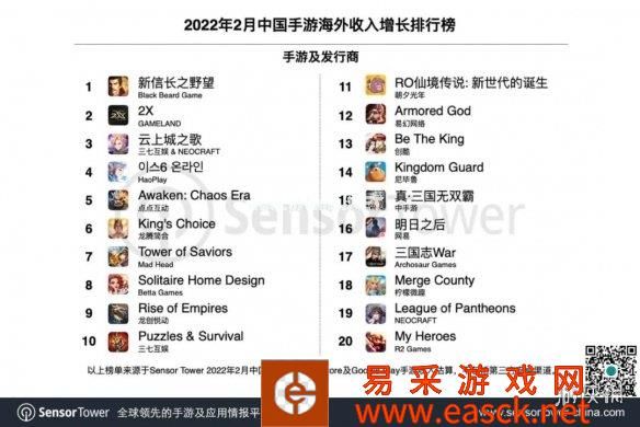 因为大多数热门游戏的收入稳定,因此在收入增长榜上就很少见到它们,许多都是一些人气较低的游戏。不过在20款手游中,出现了网易《明日之后》的身影。 2月出海手游下载榜: