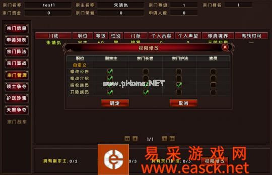 【尽忠职守 广招纳贤】 想让一个宗门走向强盛,首先需要广收成员。身为宗主必须尽一切可能邀请广大仙友加入自己的宗门。扩大宗门规模期间,也一定要管理好宗门各项事务呀。为了让宗主有忙里偷闲多打两只BOSS的时间。在宗门系统中,设立了副宗主、长老与护法的职位,宗主可以根据宗门实际情况安排职务。本着能者多劳、权限可控的目的,宗主可以设定不同职务的职能权限。但是为了宗门更好的发展,切勿做甩手掌柜哦!