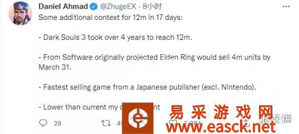 Daniel Ahmad对FromSoftware预测的《艾尔登法环》销量进行了分析: