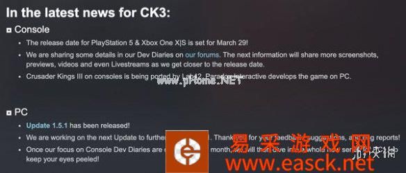 另外,官方还公布了有关本作主机版和PC版的一些消息,情况如下: 主机版: PS5及XSX|S版将于3月29日上线 临近主机版发售日,将有包括截图、视频甚至是直播等新内容公布 主机版《十字军之王3》将由Lab42移植 PC版: 1.5.1更新现已上线 工作室正在开发进一步支持1.5.1的更新 主机版开发工作将于本月晚些时候结束,之后工作室会立刻投身于全新系列的开发。
