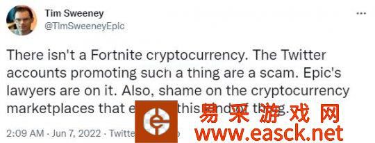 今日(6月7日),Epic Games 首席执行官Tim Sweeney发推表示:“没有堡垒之夜虚拟货币,目前宣传该事的推特账号都是诈骗,Epic法务部正在对接此事。还有虚拟货币市场应对纵容此事存在而感到羞耻。”