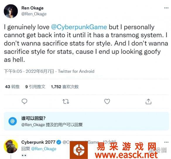 推特用户Ren Okage表达了这一诉求,他希望《赛博朋克2077》中能加入幻化系统,让玩家能保证属性强度的同时,也能根据自己的爱好自由搭配装扮。《赛博朋克2077》官方账号回复了该评论,虽然仅仅只有一个表情,但意味深长。除了官方账号外,任务总监也回复了该玩家。
