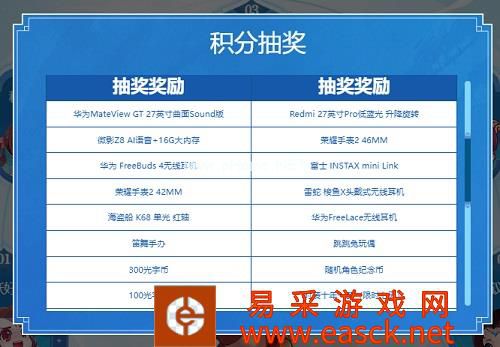 在活跃好礼活动中获得的积分还可用于积分抽奖,每次抽奖消耗500积分,就有机会获得超值数码奖品、官方手办、周边和光宇币奖励!华为手机、华为无线耳机、荣耀手表、雷蛇无线耳机等豪礼,官方周边:笛舞手办、跳跳兔玩偶,游戏内道具:时装十年一梦、特殊称号、特殊铭牌等,以及海量光宇币奖励等你来抽!