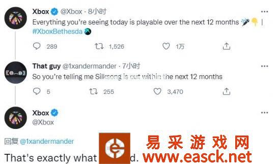 在发布会开始之前,Xbox官方推特发文表示:“所有你今天看到的内容都将在未来12个月内推出”。一位用户在推文下询问:这是否包括《空洞骑士:丝绸之歌》,Xbox也回复到:“这正如我们所说的”。