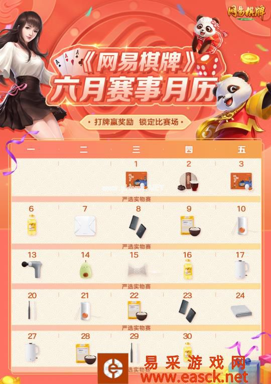 六月【严选实物赛】每工作日晚开赛,超多夏日好物等你来拿!每个工作日晚21:30比拼不停,牌友们可通过【首页-比赛场】一键报名免费参赛,将心仪奖品抱回家。驱蚊器、乳胶枕、体脂秤、空调毯……你的夏日舒适生活由《网易棋牌》承包!