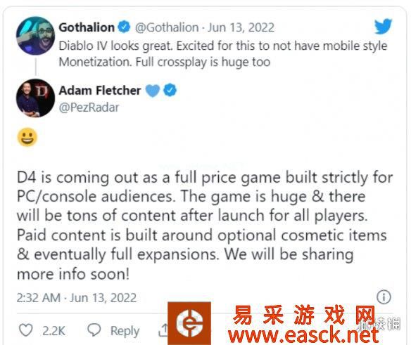 而在此前,《暗黑破坏神4》透露出会包含游戏内购,玩家们在期待这款游戏的同时,也在担心《暗黑4》的收费模式会过于“手游化”。对此,全球社区负责人Adam Fletcher回应称:“付费点在于可选的外观妆容和扩展内容,我们将很快分享更多消息!”