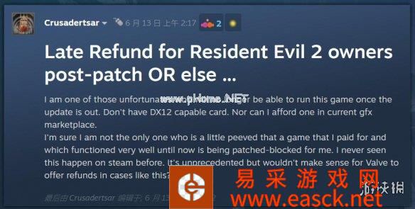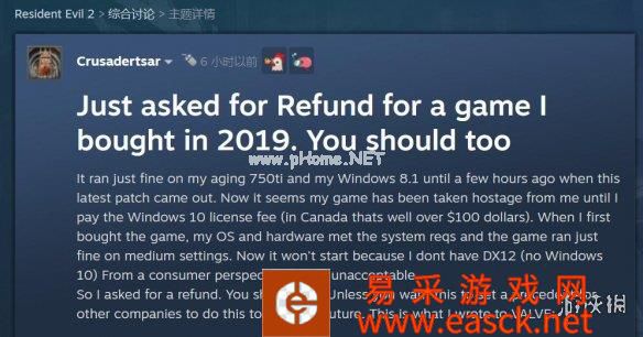 尽管DX12和Win10系统目前已经非常普及,不过仍有部分玩家没有使用它们,而且他们认为:生化危机2/3/7最初售卖的时候明明支持DX11和Win7、Win8,玩家购买游戏时也是以此为基础;结果现在的更新补丁却强制让所有玩家使用DX12和Win10,他们认为这很不合理。甚至还有几名玩家想要申请退款。