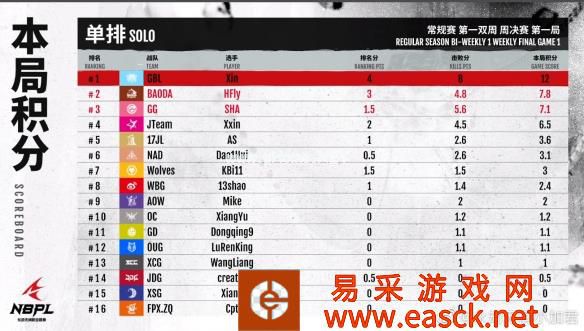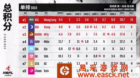 常规赛第一双周周决赛DAY1积分排行: 第一名:XCGaming电子竞技俱乐部 WangLiang选手,总积分38.7,排位分10
