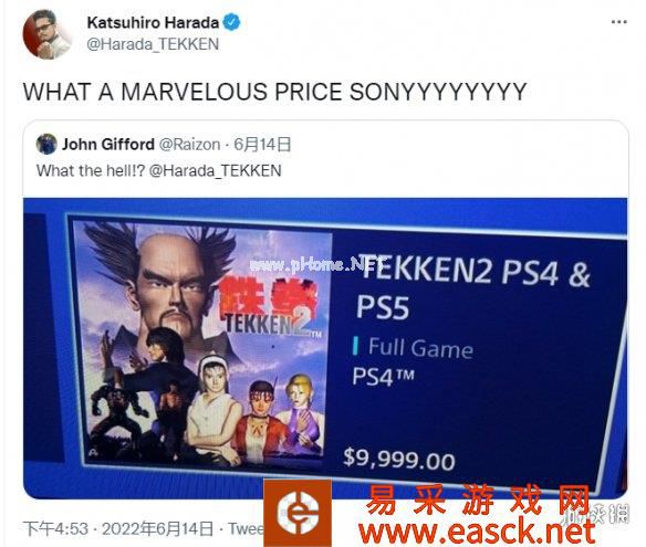 网友John Gifford(@Raizon)发现了这个逆天的标价后,@了铁拳制作人 原田胜弘,之后原田胜弘本人“称赞”索尼,说道:“多么惊人的价格啊 索尼!!!”。