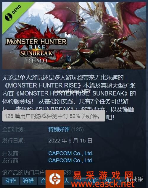 《怪物猎人:崛起:曙光》试玩版Demo现已上架Steam,目前Steam上一共有125个玩家评测,总体评价为「特别好评」,好评率为82%。