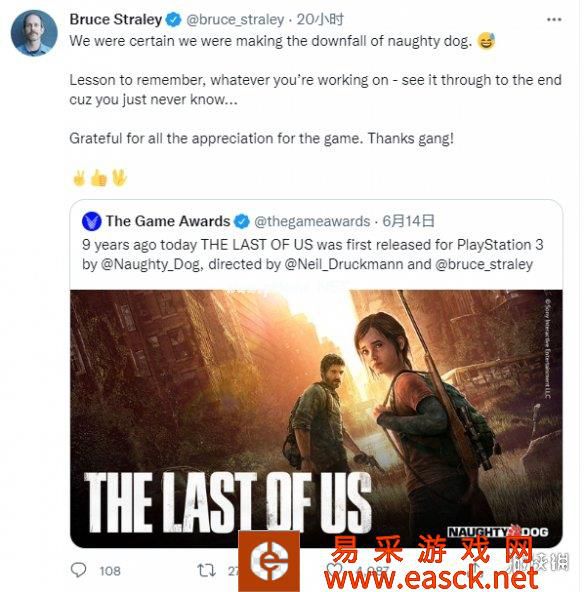 PS3版《最后生还者》九周年之际,前游戏总监Bruce Strale在推特分享了当时开发该游戏的小插曲。“我们当时确信这款游戏会让顽皮狗垮台。要记住的一课,无论你做任何事,坚持到底,因为你永远不知道会发生什么。感谢大家对游戏的欣赏!”