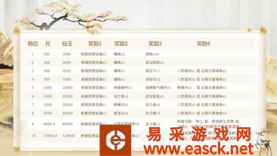 3.【新服大礼】:6月17日-6月23日期间,成功充值(寄售点除外)并且兑换指定数量仙玉后即可领取新服大礼。6月30日-7月7日期间,可开启回馈宝箱进行抽奖(每天最多使用五个)。
