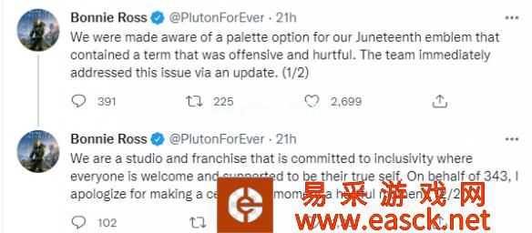 在此事件发酵后不久,343工作室给出官方回应表示:“我们被告知,我们的六月节铭牌的调色板选项包含一个具有攻击性和伤害性的术语,团队立即通过更新解决了这个问题。我们是一家致力于包容性的工作室,在这里,每个人都受到欢迎并得到支持成为真正的自我。我代表343公司,为把一个值得庆祝的时刻变成一个伤人的时刻而道歉。”