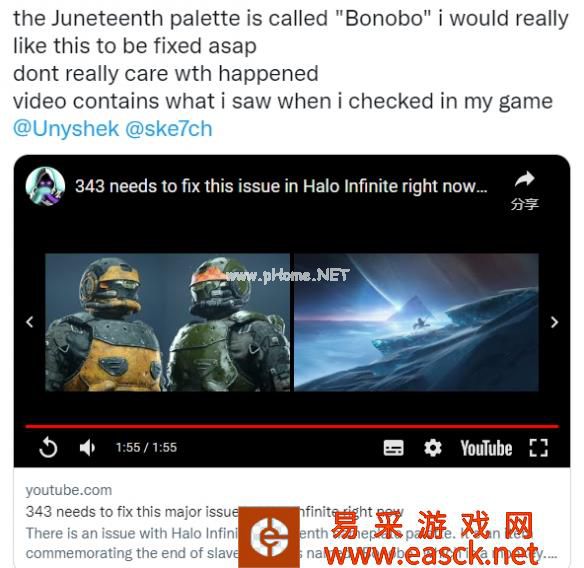 网友发现《光环:无限》将为纪念“六月节”而推出的调色板铭牌为“倭黑猩猩(Bonobo)”,在网友们纷纷表达了自己的不满引发巨量声讨后,343工作室在今日发出回应并表示“对不起,已经立即更新解决了”。