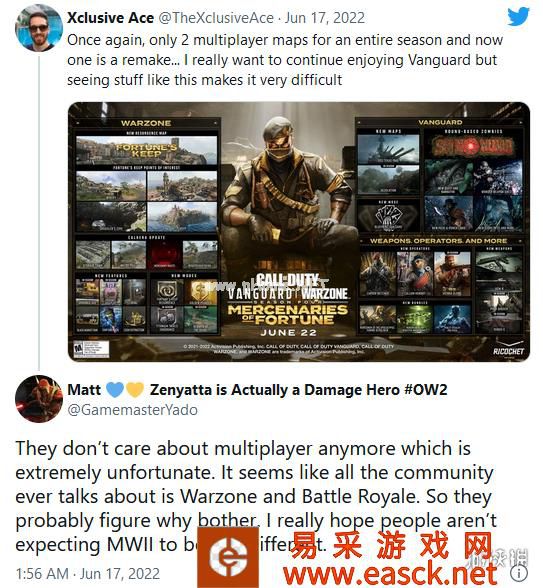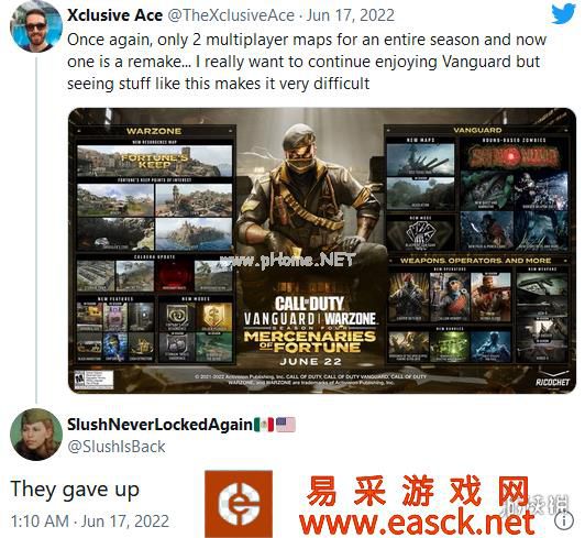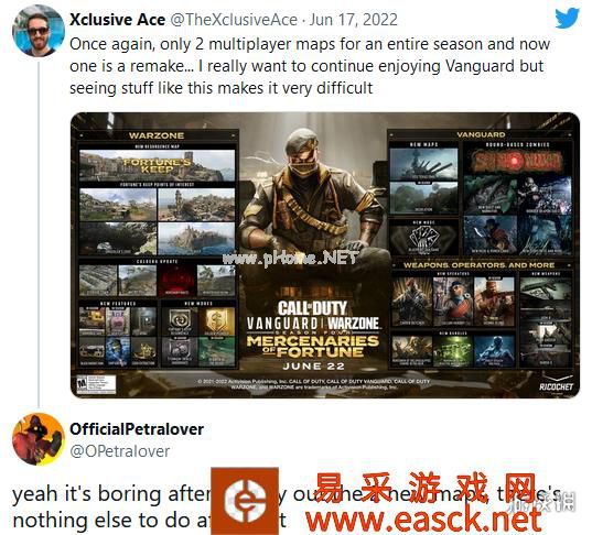 《使命召唤:先锋》第四季预计将于6月22日上线,然而距离第四赛季上线还有一周的时间,不少玩家却因为游戏更新缺少多人游戏内容表示失望。 在昨日,《使命召唤》公开了《使命召唤:先锋/战区》第四季更新路线图,这让玩家们对6月22日的新内容更新有了更深入的了解。路线图展示了大量即将进入战区的新内容,包括一个新的卷土重来大逃杀地图,新的游戏内机制,和卡尔德拉地图更新。 但在提及《使命召唤:先锋》时,玩家会觉得游戏内容极度匮乏。 就《使命召唤:战区》第四季的内容而言,这足以让玩家玩上几个月,尤其是新地图“财富城堡”的到来。在整个赛季中,战区玩家还将获得6个新功能和4个新模式,以及新的武器和干员。那么反观《使命召唤:先锋》呢? 如果你是一位僵尸模式粉丝,那么僵尸模式添加了回合制地图“死亡沼泽”这将是个好消息。但是在提到多人游戏部分时,《COD:先锋》的玩家想必都非常失望。虽然提供了一个新模式以及两张新地图(其中一张为《使命召唤:二战》德克萨斯战列舰地图的重置版),但内容相对于《战区》来说少了不少。 不少粉丝都在推特表达了自己对于《先锋》第四赛季多人游戏内容的失望,一些人简单的表示这“让人难过”,但也有一些粉丝表示“开发者放弃了”。 |