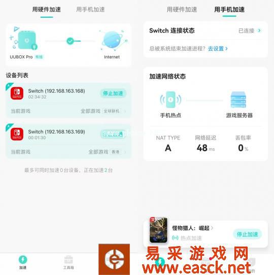 以上就是关于《怪物猎人崛起:曙光》试玩Demo的相关情报了,相信这次试玩内容一定会让各位猎人们过瘾。而在DLC正式上线后,如果小伙伴们想要在和好基友联机时获得最佳体验,小编推荐大家使用网易UU加速器推出的UU加速盒,它针对NS有专门加速方式,不但可以解决联机过程中可能出现的卡顿、掉线等网络问题,同时,如果你想要随时随地体验联机狩猎的快感,可以使用UU主机加速APP中的热点加速功能,能够让你摆脱wifi限制,尽情体验游戏乐趣。