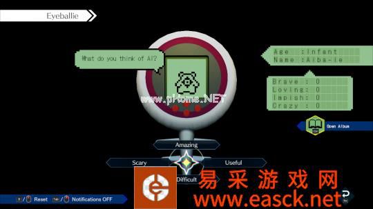 Eyeballie 《Eyeballie》是一款迷你游戏,玩家可以在其中养育出一个神秘的生物。每隔20分钟,好奇的Eyeballie就会问你一个问题。玩家将通过从四个答案中选择一个来回答。Eyeballie将通过玩家给出的答案成长,如何发展将取决于玩家的答案。