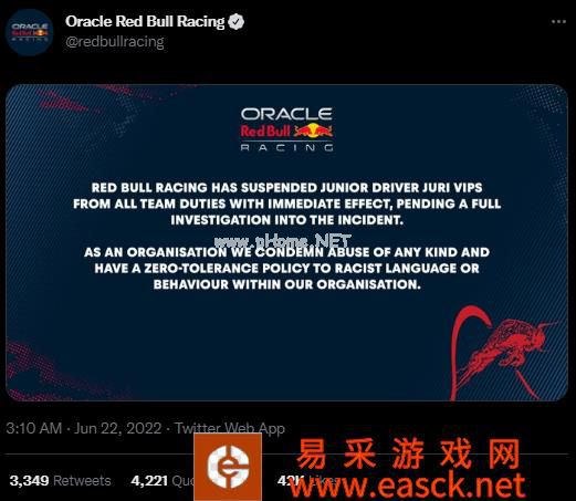 自从直播这一模式兴起,低门槛所带来的诸多问题逐渐显现。如同知名演员一样,主播们在轻松获取高昂打赏的同时,也担任着一定的社会形象。当然,在这个人均显微镜观察的时代,即使是最专业的主播也会失误,而这些失误所产生的后果,往往是当事人无法承担的。现在,一则短短的录屏视频将完全摧毁某人的职业生涯。 【网】维普斯游玩《战区》录屏片段 F2车手尤里·维普斯(Juri Vips)已被F1红牛车队停赛。原因在于,他之前与队友利亚姆·劳森(Liam Lawson)一起游玩游戏的录屏在Twitch被疯狂转发。在游玩《使命召唤16:战区》时,维普斯被敌人所击伤,并在愤怒中脱口而出“fuck n-word ”,而“n-word”一词普遍代指“黑鬼”。