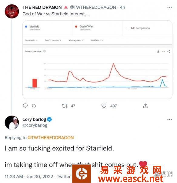 在推特上,有粉丝说索尼《战神》新作的搜索热度远高于微软《星空》Cory Barlog他回答说,他期待着《星空之地》,游戏发布后他会请假(玩星空)。
