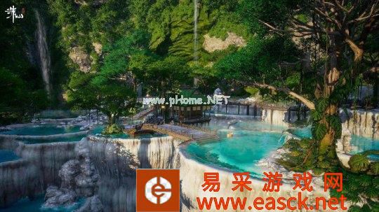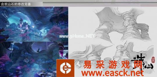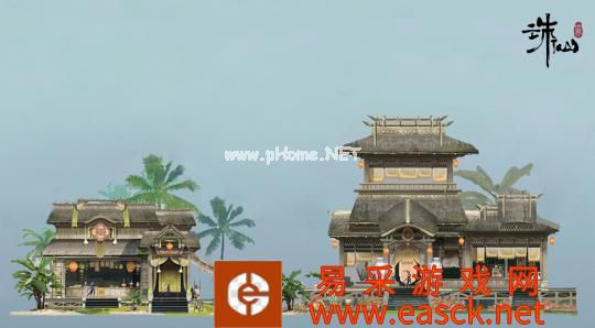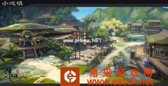 小池镇原画 首先,没有人知道东海仙岛是什么样子的,只能通过想象力和现实主义来实现。因此,流浪场景的设计理念是指海洋岛屿的灵感。地图中西北为山,东南为海。有不同的岛屿和不同风格的建筑,如小池镇。合欢门派地图也在流浪地图中。