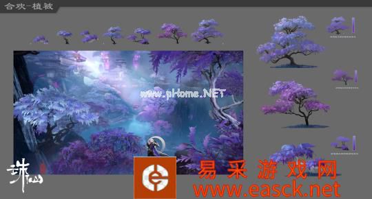 最后,一些场景中的植被设置,主要是海洋植物,主要是紫色,紫色是浪漫的代表,加上翅膀鸟的概念,叶子采用了许多羽毛风格的设计,自然也形成了一个非常独特的风景。