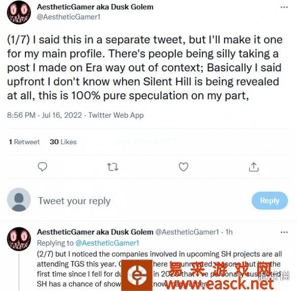 根据著名的叔叔党 Dusk Golem 据说《寂静岭》的新作似乎有可能在9月份的东京电玩展上公布。然而,这一披露完全是他自己的猜测,而不是来自一些内部渠道。 Dusk Golem 这一猜测是因为与《寂静岭》相关的公司都参加了东京游戏展。更有趣的是,一些公司首次参加东京游戏展,这提高了我们在东京游戏展上看到《寂静岭》的可能性。