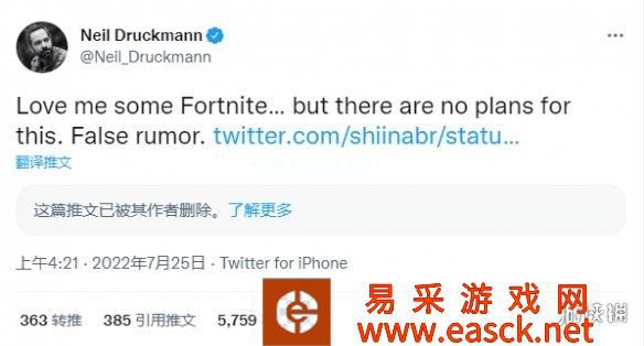 最后生还者(The Last of Us)》导演尼尔·德鲁克曼在推特上说,他非常喜欢《堡垒之夜》,但没有计划与这款大逃亡游戏联动合作。