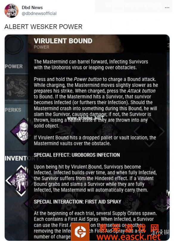根据“舅舅党”们可靠的消息来,最新泄漏让我们现在可以提前看到即将到来的《黎明杀机》X《生化危机》联动角色的技能,包括威斯克、艾达王和瑞贝卡。