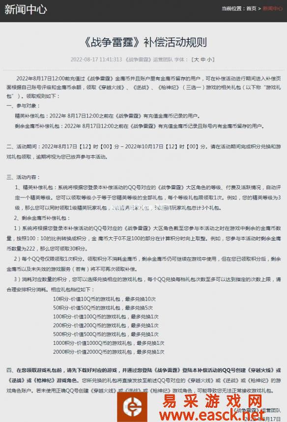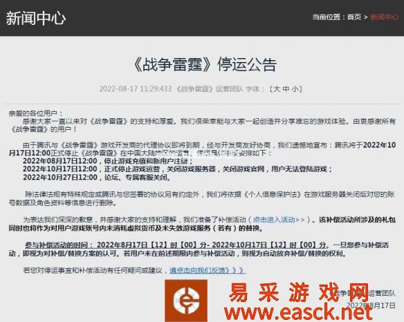 官方公告: 亲爱的各位用户: 感谢大家一直以来对《战争雷霆》的支持和厚爱。我们很荣幸能与大家一起创造并分享难忘的游戏体验。由衷感谢所有《战争雷霆》的用户! 由于腾讯与《战争雷霆》游戏开发商的代理协议即将到期,经与开发商友好协商,我们遗憾地宣布:腾讯将于2022年10月17日12:00正式停止《战争雷霆》在中国大陆地区的运营。停运具体事项安排如下: 2022年08月17日12:00,停止游戏充值和新用户注册; 2022年10月17日12:00,正式停止游戏运营,关闭游戏服务器,关闭游戏官网,用户无法登陆游戏; 2022年10月27日12:00,论坛、专属客服关闭。 除法律法规有特殊规定或腾讯与您签署的协议另有约定外,我们将依据《个人信息保护法》在游戏服务器关闭后对您的账号数据及角色资料等信息进行删除。 为表达我们深深的歉意,并感谢大家的支持和理解,我们准备了补偿活动(点击进入活动>>)。该补偿活动所涉及的礼包同时也将作为对用户游戏账号内未消耗虚拟货币及未失效游戏服务(若有)的替换。 参与补偿活动的时间: 2022年8月17日【12】时【00】分- 2022年10月17日【12】时【00】分。一旦您参与补偿活动,即视为对补偿/替换方案的认可。若用户未在前述期限内参与补偿活动,则视为自动放弃补偿/替换的权利。 若您对停运事宜和补偿活动有任何疑问或建议,请点击向我们反馈》》》 《战争雷霆》运营团队 2022年8月17日
