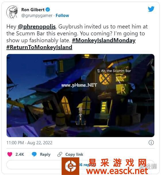 Ron Gilbert表示:如今人们真正想要的是游戏中内置的提示系统,但他也向粉丝保证,这种全新的提示系统不会影响游戏的玩法,相反,它是有意义的,它不只是玩家的一份攻略那么简单。 值得一提的是,《重返猴岛》也将会在明天的科隆展开幕夜直播会上亮相,官方已经表示届时将会发布一些“大消息”,也许是公布发售日期?