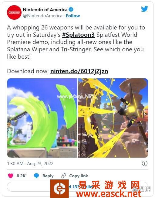 这款游戏将于下个月正式发售,不过在游戏发售之前,任天堂将会发布一个游戏的试玩Demo,给玩家一个机会提前体验下它的多人模式,这个Demo将于几天之后发布。 任天堂美国的官推今天发布了一条推文,确认了周六的试玩Demo将会包含26种武器供玩家体验试玩。