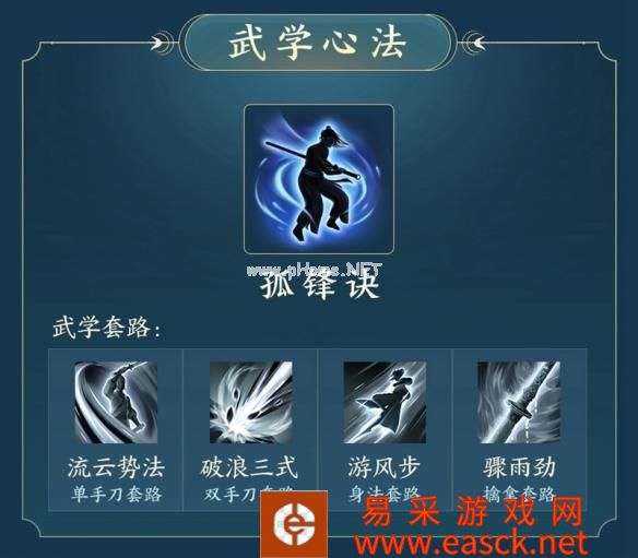 刀宗的武学心法为“孤锋诀”,共有四种武学套路,包含单手刀、双手刀、擒拿短打贴身格斗以及门派轻功步法。武学套路注重实战效果,杀伐凌厉攻守一体,乃是谢云流在自身原有武学基础上,独创出一门在敌方出招时找出敌方破绽,打击对手最为薄弱的地方以击溃对方的攻势,达到一击制敌的目的。 流云势法:主为单手持刀的攻击方式,对目标发动连绵攻势的同时还能找到其招式的弱点,从而更巧妙地战胜目标。 游风步:主为身法类招式的套路,该套路下刀宗拥有极强的移动能力和生存能力,在追击目标和逃离战场的选择中游刃有余。 破浪三式:主为双手持刀的攻击方式,该套路下将进攻发挥到极致,每个招式都具备强有力的攻击能力。 骤雨劲:主为擒拿搏击的进攻套路,可以更好的限制目标移动能力,与“流云势法”交替施展效果更为强大。